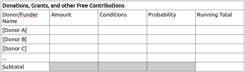 Only $500 is added to the running total in the second row because there is only a 50% chance the enterprise can meet the conditions (reducing the amount to $1,500) and the probability of getting the donation, even if the group can meet the conditions, is only 33% ($1,500 x 33% ≈ $500).
