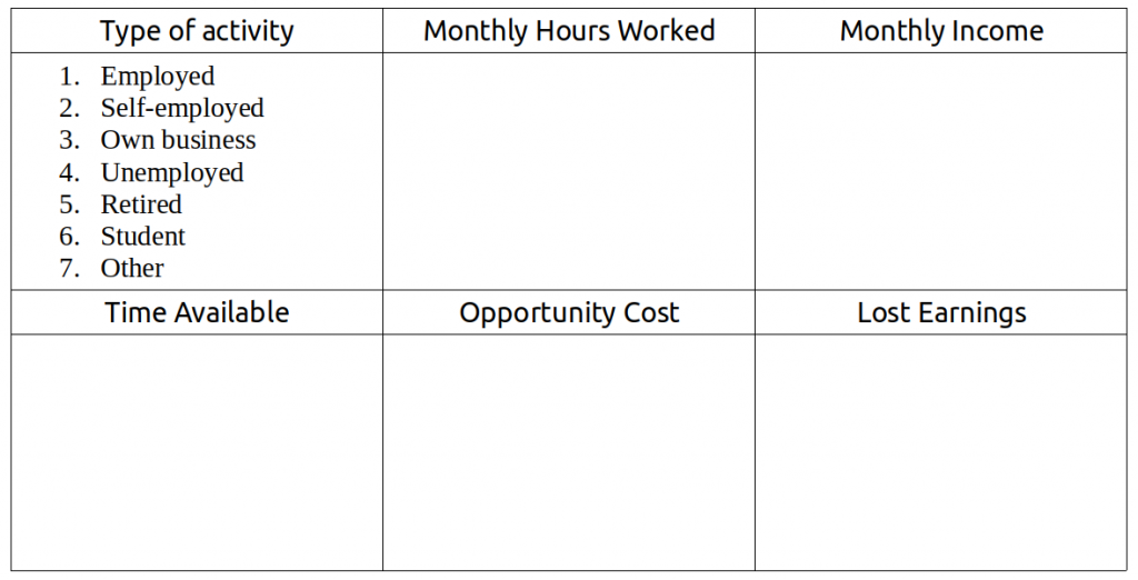 But it should be noted that the opportunity costs can differ from the income that the factor could generate in the market, since there are usually costs associated with use of the factor and the acquisition of that income, which should be discounted when quantifying the opportunity cost. For example, from the remuneration of labor one should discount the cost of transportation, if this is no longer needed when working at the solidarity enterprise. The same applies to taxes paid on rental income and so on. On the other hand, there are also benefits that are lost when removing a factor from its current use. Those too should be quantified and in that case added to the income as their loss also implies an opportunity cost.