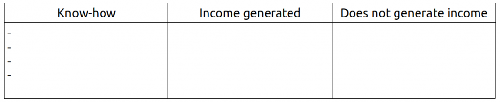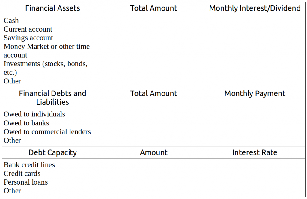 We call the analysis produced in this task a “personal balance sheet” because it resembles the information banks often demand of potential borrowers in order to evaluate their credit worthiness. In our case, the “personal balance sheet” deals with more than the usual aspects and is produced using a form that is structured differently. Each person should complete the following form: