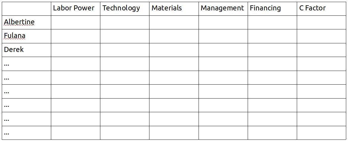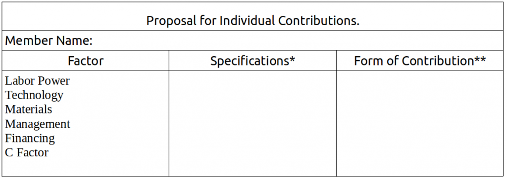 The purpose of this task is to determine exactly which factors each person possesses, their possible utility and productivity in the solidarity enterprise, and the member’s willingness to contribute the factors the possess, taking into account potential opportunity costs and lost earnings.
