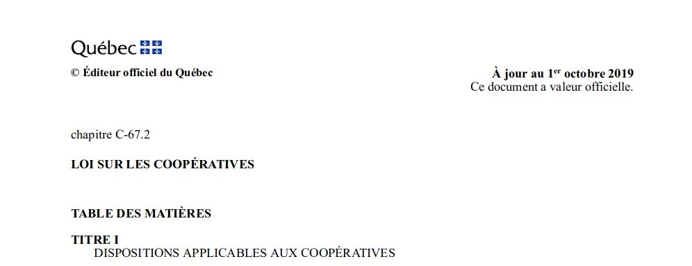 Texte de la Loi sur les coopératives du Québec. Utile pour obtenir une connaissance avancée des technicalités du modèle coopératif dans cette juridiction. (80 pages.)